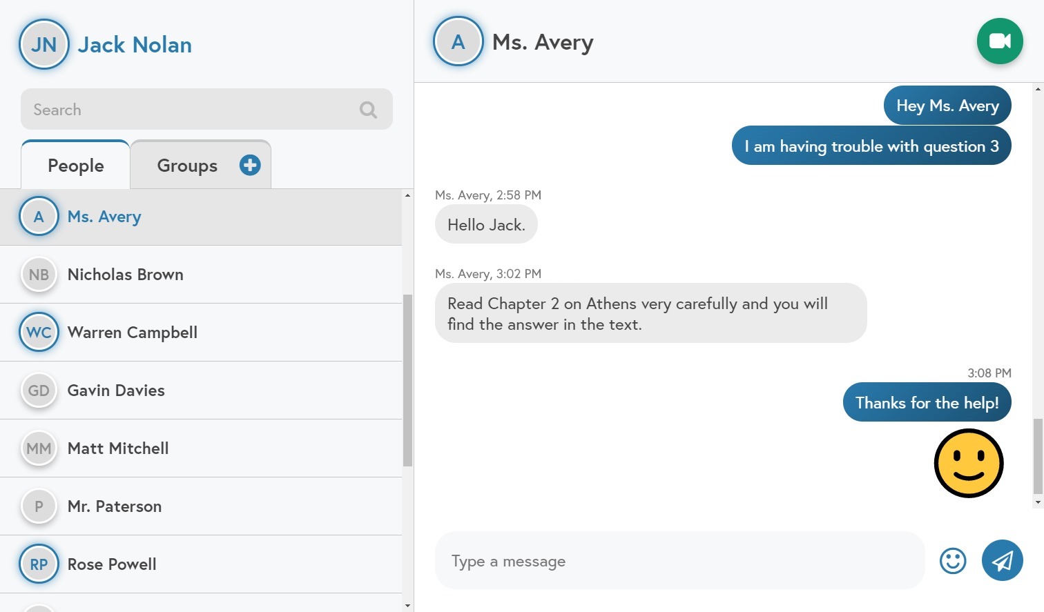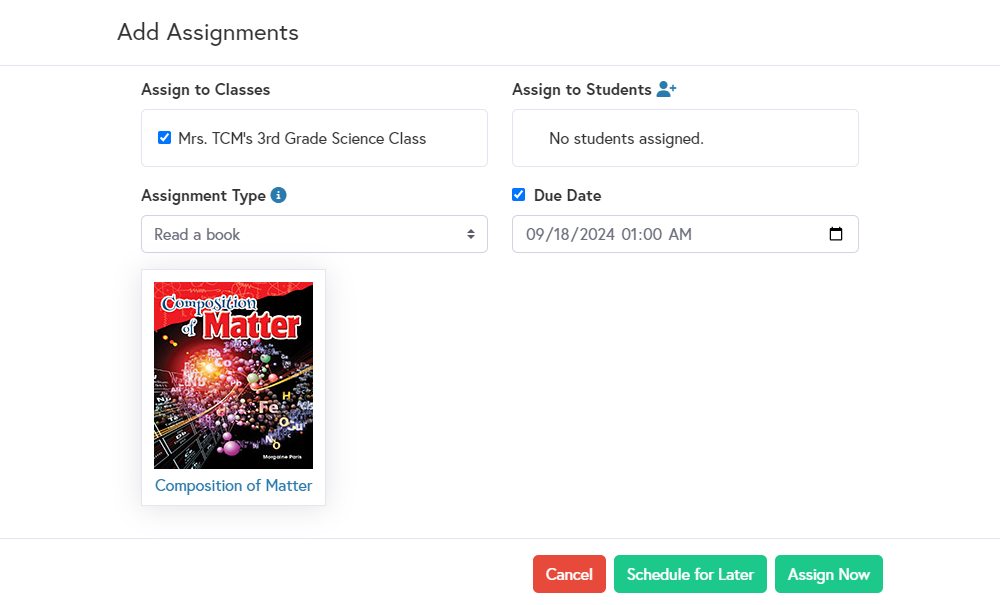 Assign readings, video recording, and quizzes to multiple classes or individual students.