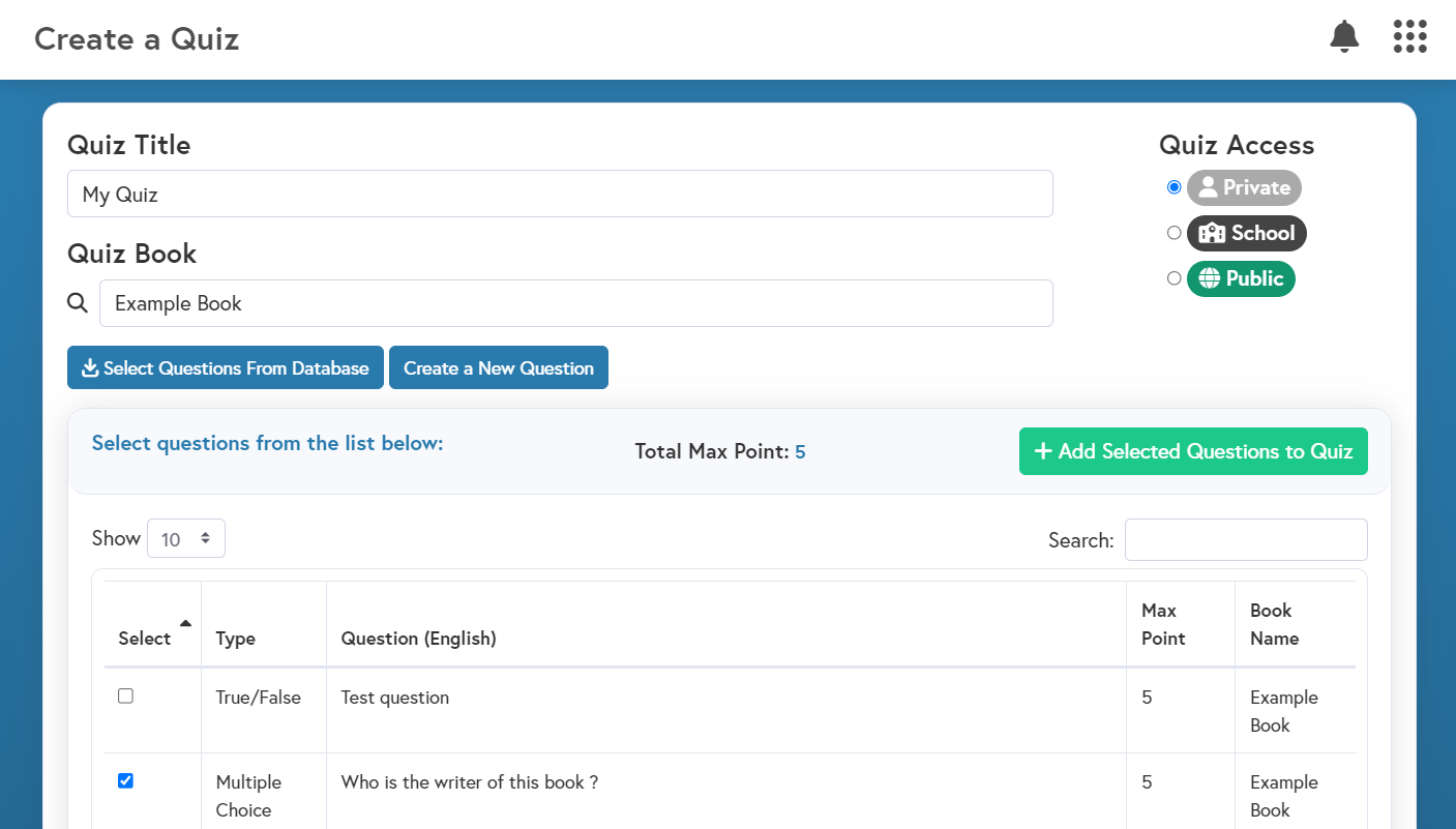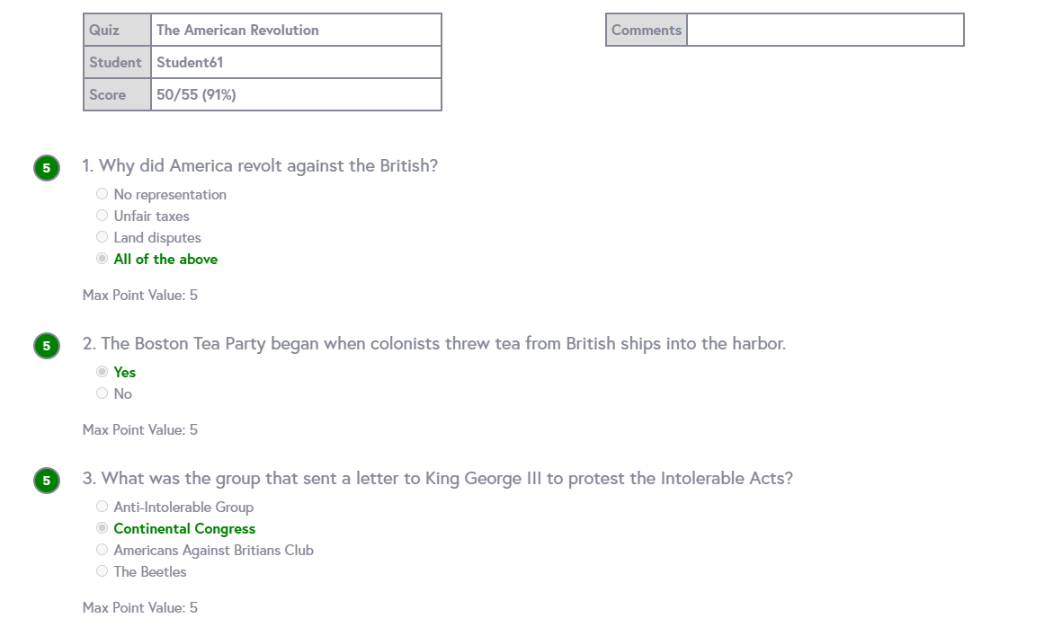 Create quizzes from validated questions in a shared database or create your own questions. Computer graded for multiple choice, matching, & check-all-that-apply. Teacher graded for essay and fill-in-the-blank.
